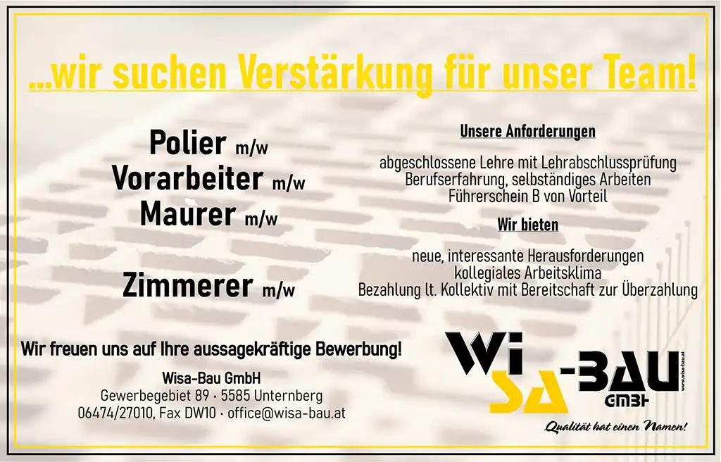 Die Firma Wisa-Bau GmbH und ihre Mitarbeiter sind seit dem Jahr 2014 arbeitnehmerschutzrechtlich bestens aufgestellt. Neben dem Sicherheits- und Gesundheitsschutz wird auch ein Gesundheitsmanagement verfolgt. Gemeinsam mit Elfi Schitter und ihrem Team wurde das Modell auf die Firma WiSa-Bau maßgeschneidert. Das Konzept „Gesunder Wettbewerb“ ist in dieser Form einzigartig in Österreich und stammt vom Salzburger Beratungsunternehmen Schitter & Co.
